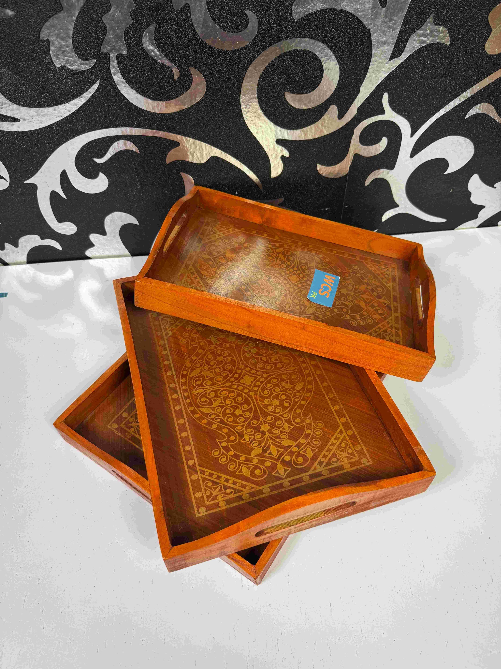 A stylish set of 3 wooden trays featuring elegant printed designs. Perfect for serving tea, coffee, or snacks, these trays also make a beautiful decorative accent for your home. Lightweight, durable, and easy to carry, they combine practicality with artistic charm.
